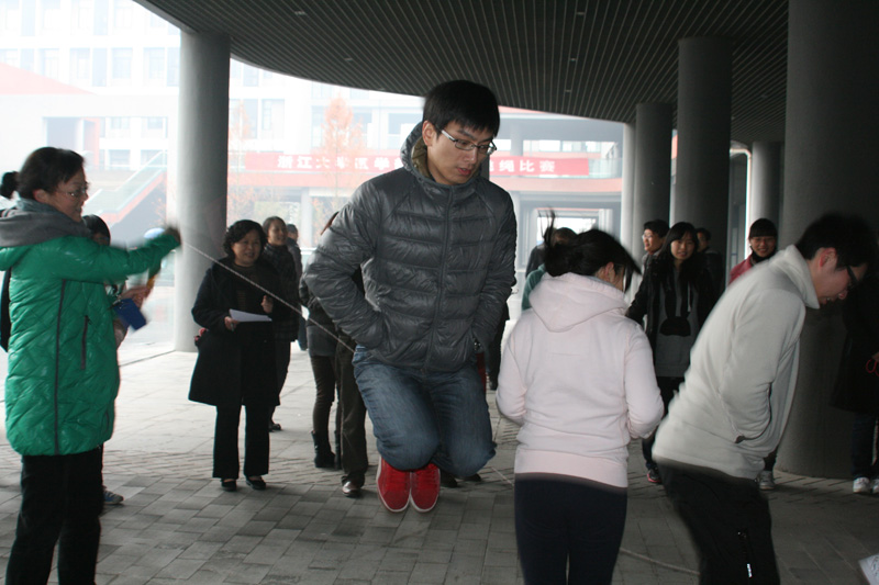 初冬的午后,细雨夹着微微的凉意,但在紫金港医学部综合楼前广场上却是一番热火朝天的景象。2011年12月20日中午,我部工会健身月活动系列活动之一---趣味跳绳比赛正在紧张地进行着。医学部党委副书记、工会主席吴弘萍宣布比赛正式开始,来自药学院、基础医学系、公共卫生系和学部机关共8支参赛队伍开始了这一场精彩地角逐。趣味跳绳比赛设单人跳、男女双人跳和集体跳(五人组合)等项目,最终以规定时间内次数多少决定名次。