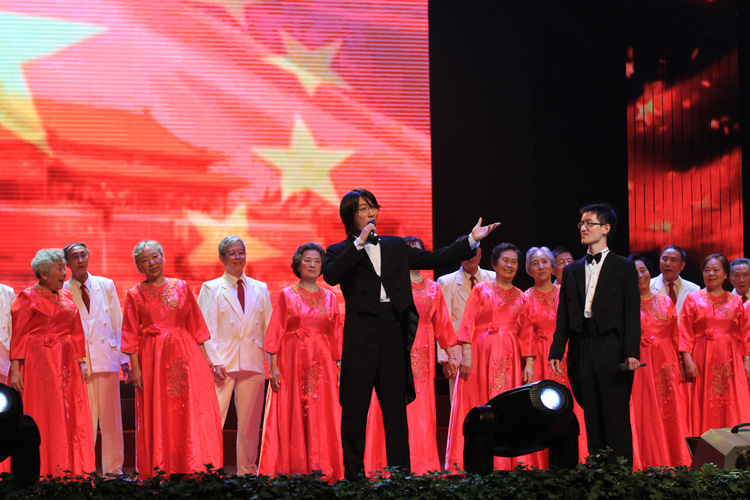 在浙江大学校歌中,学校、学部领导走上舞台,同演职人员热情握手,祝贺演出成功。领导、校友、演职人员和同学们共同合影留念,将这欢庆气氛深深印在心中,共祝浙江大学医学部一百岁生日快乐!
