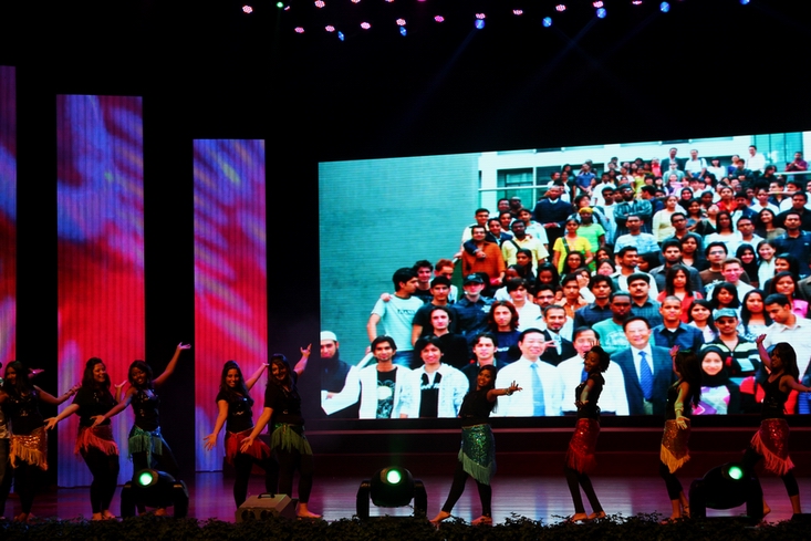 紫金港剧场内,华灯璀璨,鲜花芬芳,大屏幕上滚动播放浙医校友对母校的视频祝福,涌动着浓浓情意。