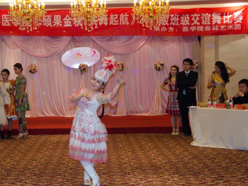 19:00许,在主持人和嘉宾热情洋溢的致辞中,舞会正式开始。10个班级代表队按照抽签顺序依次步入舞池,伴着时而悠扬时而奔放的乐音尽情舞动。华丽的服装,精致的妆容,精心编排的队形,甚至有变魔术般出现的玫瑰,无一不在向人们展示着医学生独有的艺术气质。思绪跟随舞步,时而是恋人惜别,时而又是情人相会,选手们都在用舞步诠释着内心,现场的掌声从未停歇,舞会之中穿插的自由舞环节更是精彩,一对对搭档相携走入舞场,在慢三慢四的音乐中徜徉,眸光里尽是幸福。最终被评为“舞蹈公主”王安鸽和“舞蹈王子”顾杨军的两位同学跳的更是精彩,流畅的舞步,飘逸的裙摆,温柔的笑靥为这俊男靓女的组合赢得一片掌声。特邀而至的新疆姑娘更是用她们热情奔放的舞姿将气氛推向另一个高潮。在舞会末,临床1108班的成绩脱颖而出,获得了一等奖的好成绩,为此琚莉莉同学也获得了“优秀舞编”的荣誉称号。