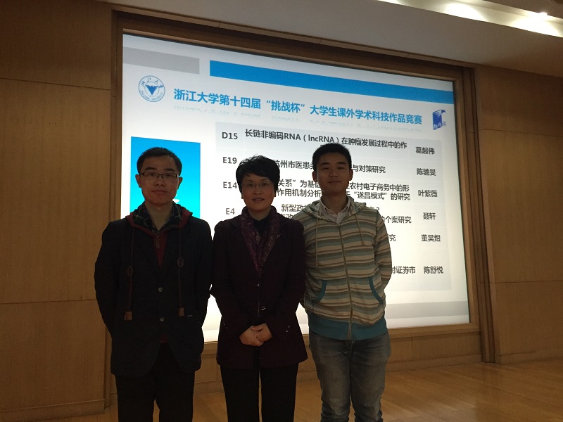 2015年3月27日,浙江大学第十四届“挑战杯”大学生课外学术科技作品竞赛决赛在紫金港校区国会225举行。本届挑战杯于2014年10月正式启动,受到全校师生的广泛关注。经过院级选拔、学科类别复赛等环节,共有八十余项作品晋级决赛,医学院基础医学系欧阳宏伟教授指导的学生2010级七年制陈鹏飞作品、王青青教授指导的学生2012级五年制葛起伟作品及转化医学研究院王本副教授指导的学生2009级八年制赵斌杰成功晋级决赛。其中,陈鹏飞同学作品最终晋级为十一强作品进入当晚的公开答辩。