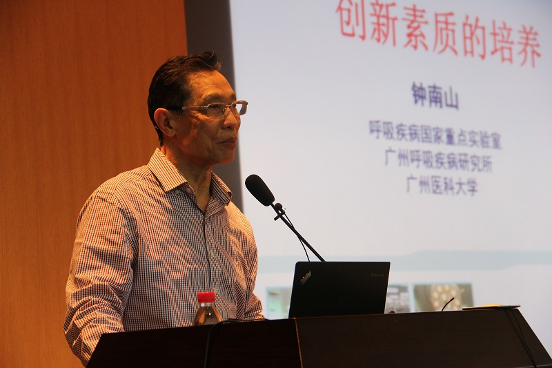 接着,钟院士开始了题为《创新素质的培养》的精彩报告。钟院士从“创新”和“创新驱动对人才素质的要求”两个方面进行了精彩的演讲。他指出真正的创新不只是发表学术论文,而是要更注重其实际意义,并从“执着追求”、“尊重事实”、“崇尚诚信”、“合群协作”和“健康体魄”这五个要素精彩诠释了创新驱动对人才素质的要求。钟院士结合自己最初研究慢性阻塞性肺病的经历,告诉同学想成为一个创新的人才,首先是要有执着的追求,很多事情是从责任的“要我做”到培养兴趣再到热爱和成为追求的学会“我要做”。关于“尊重事实”,钟院士举了当年抗击非典时研究支原体的例子,告诉学生权威的意见不一定是对的,自己的实践或者是亲眼看到的是可信,一定要尊重事实。关于从“崇尚诚信”,钟院士结合英出版商近期撤销43篇造假论文事件,告诫学生成为一名科学家的底线就是不能作假,诚信是创新的必备素质。关于“合群协作”,钟院士认为重大的创新是协作,协作的前提是共赢,协作的成功靠号召力。他结合年轻时去英国留学的例子,告诉学生人天生需要别人尊重,在与人合作中,最重要便是尊重他人。关于“健康体魄”,钟院士酷爱运动,曾是一名运动健将。今年已经年近八旬,依然精力充沛,坚持体育锻炼,奋斗在临床教学科研第一线。他告诫同学们,“不要忘记,你们现在有很强的潜力,所以你熬夜或者不吃饭、不睡觉,还可以熬。但是到你40岁、50岁的时候你就感觉到(精力不济)。所以我希望大家一直维持精力旺盛,很好地从事你的研究工作。希望在座的同学都把自己培养成一个创新型的人才”。在问答环节,同学们踊跃地提出了许多与医疗制度、科研等相关的问题,钟院士一一给出了详细的回答。