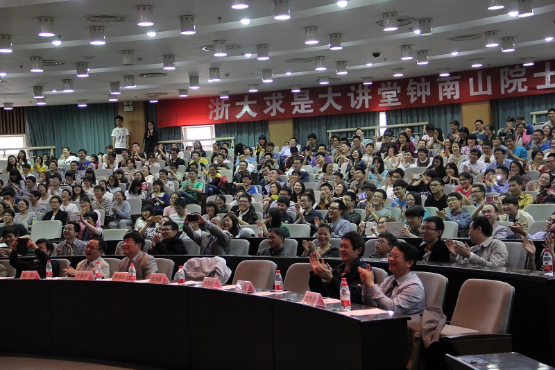 浙大求是大讲堂暨医学院“名师名医大讲堂”第八期——钟南山院士报告会于2015年4月17日下午在紫金港校区国际会议中心225室成功举办。本次讲座受到学校及相关部门的高度重视,由党委宣传部、学工部、研工部、校团委、医学院、求是学院蓝田学园联合举办。广州医科大学附属第一医院广州呼吸疾病研究所名誉所长、呼吸疾病国家重点实验室主任钟南山院士担任报告主讲人,和浙大学生畅谈创新素质的培养。浙江大学党委副书记任少波,党委研工部部长吕淼华,校团委书记刘艳辉,党委学工部副部长李文腾,求是学院蓝田学园主任赵阳,求是学院蓝田学园副主任吴为进,医学院党委副书记陈国忠等领导出席了本次讲座,600多位师生参加了此次讲座。报告会由医学院副院长、浙江大学呼吸疾病研究所所长沈华浩教授主持。
