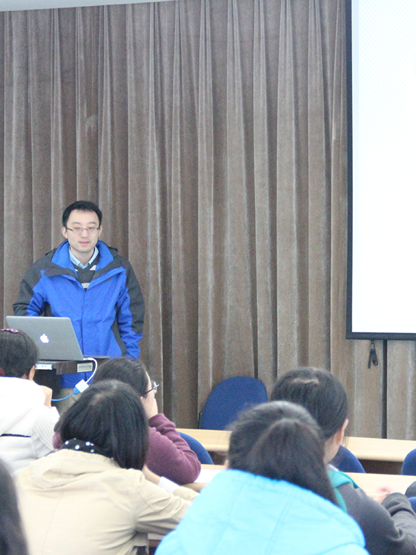 下午2时15分沙龙开始。首先,主持人介绍了陈伟老师在国内国外的求学经历以及在生命科学邻域的研究方向和成果。接着陈伟老师结合PPT展示开始演讲。陈伟老师的演讲分为三个部分:“DON’T SETTIE,KEEP LOOKING ” “ FOLLOW YOUR HEART ” “APPRECIATION &LOVE”。陈老师介绍了在自己在国外如何结识朋友,如何申请到美国大学的生命医学专业,如何从电气专业走上研究生命科学的道路,并且简单介绍了美国大学科研中的生命科学与物理学的交叉的情况。陈老师讲述了自己从接触基本的生命科学基础开始,在国外的11年的时间里,面临抉择时的困惑,对出路的迷茫,对科研的热爱,以及坚持后的收获。鼓励同学们做自己真正喜欢的事情,基于自己的爱好往下走,从而心甘情愿的为之奋斗。陈伟老师还通过三次的生命科学革命,阐明了如果将生命科学与工程物理、化学、经济整合在一起,对整个人类社会的积极意义。