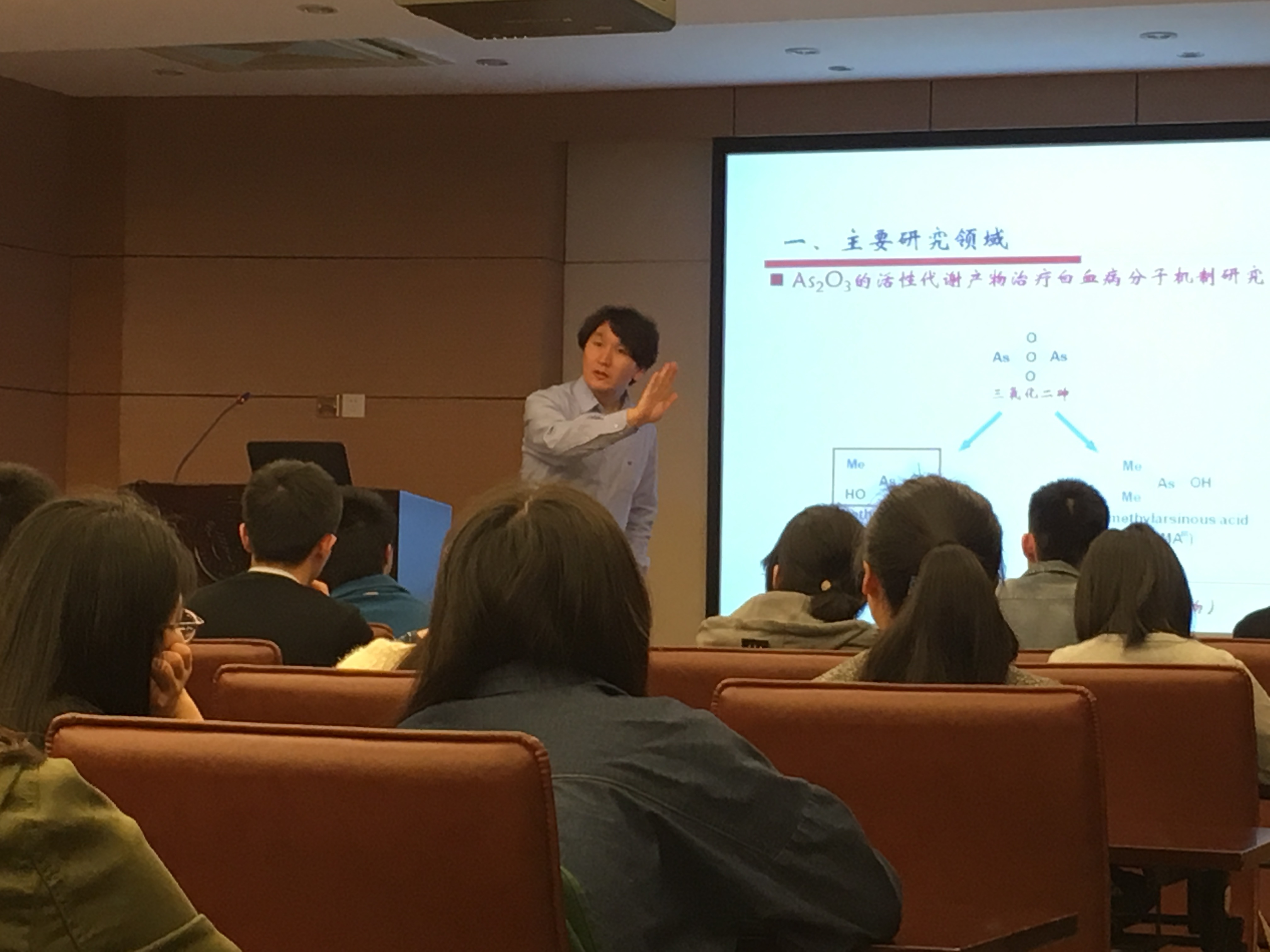随后,那仁教授向我们介绍了他的主攻毒理学SOT(Society of Toxicology)及他最近五年主要的研究成果。主要包括:As2O3的活性代谢产物治疗m3白血病分子机制研究;首次发现砷代谢产物介导线粒体阴离子通道诱导细胞凋亡机制及此产物没有降解PM-RARa融合蛋和诱导细胞分化功能(诱导凋亡);靶向药物适配体(Aptamer)的发现及对肿瘤的治疗。