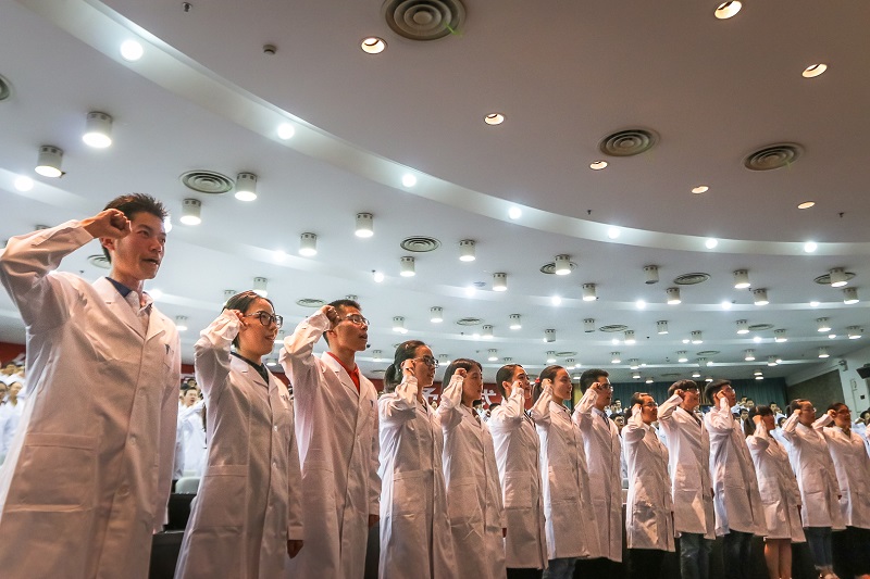 接着,举行了庄严隆重的宣誓仪式,由王伟林院长领誓,全体2015级医学生宣誓。“健康所系,性命相托”响亮而又庄严的誓词在蒙民伟楼回荡。这是每个医学生跨入医学殿堂的第一步,穿上这一身白大褂,就注定终身奉献于祖国医药卫生事业的发展和人类身心健康。