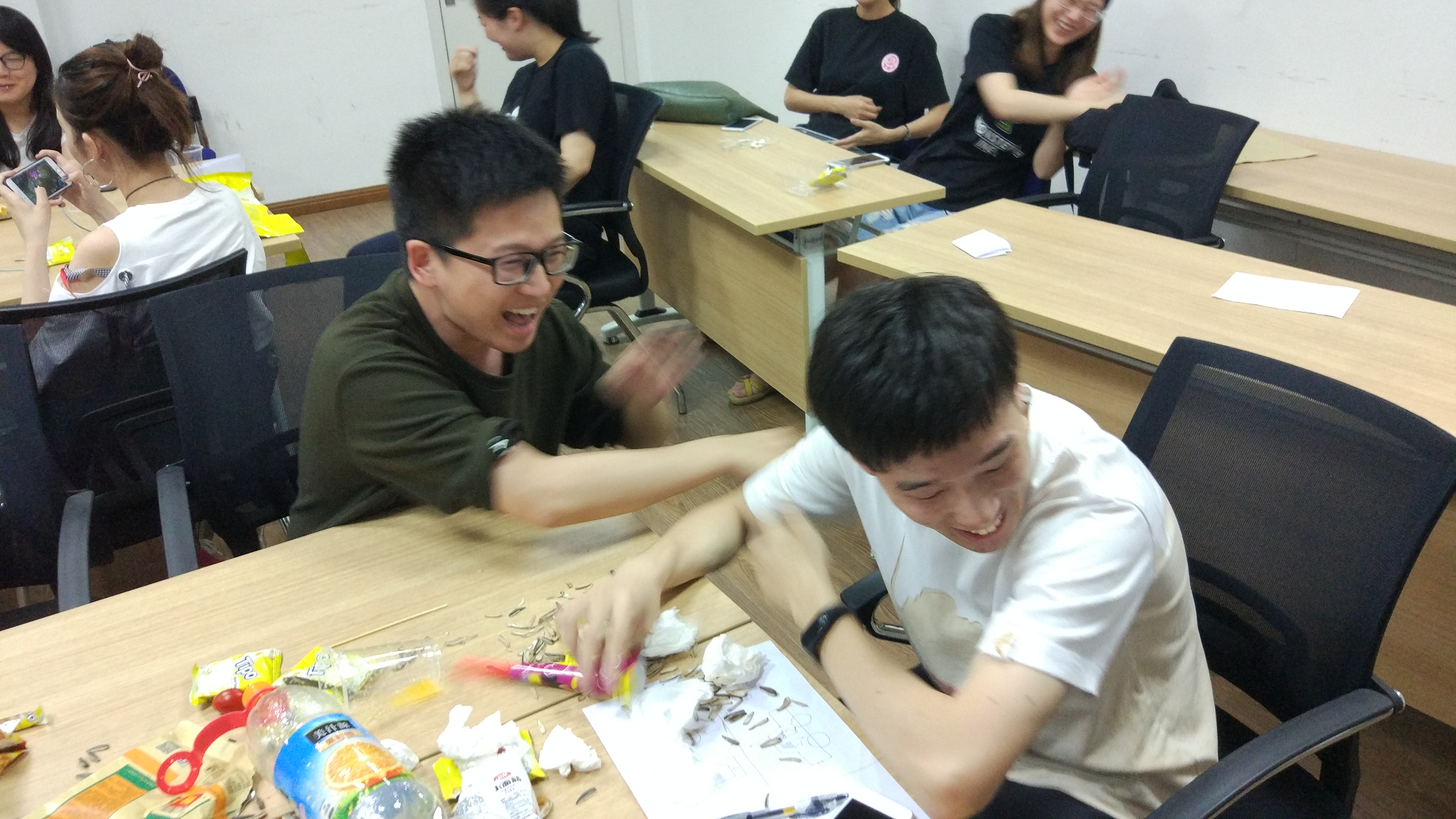“干了这杯酒”,最后就是班会必备游戏环节啦!内建委员张黎悦和钭赉振精心准备了你画我猜、N手N脚、唇语传音等游戏,脑力与体力活动的大爆炸,听诊器的传神画工、甲状腺的图画到最后变成了哆啦A梦、救护车画到最后变成婚车,还有N手N脚时的脑洞大开和奇葩姿势,唇语传音最后猜出来的话面目全非······在欢乐的游戏中,大家互相合作,互相加油,而场外观众也不忘混淆视听,乐此不疲。