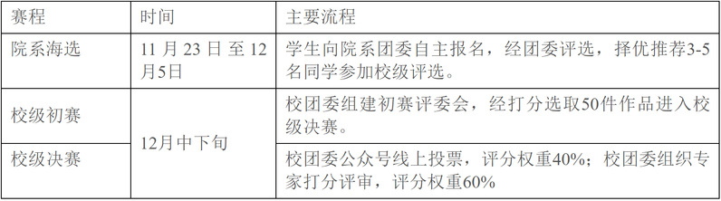 本次院系海选活动参赛作品经团委评选,择优推选3-6名同学参加校级评选;同时,院级将评选出以下奖项: