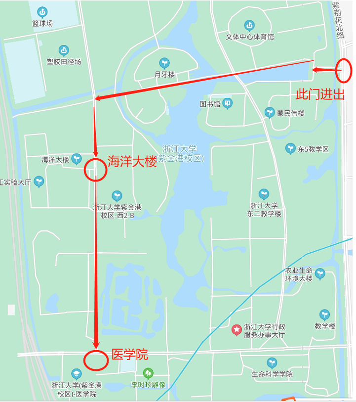 所有考生凭准考证、“亮码+测体温+戴口罩”,从浙江大学紫金港校区东2门(申花路口)考试专用入口进入校园,沿指定路线至考场(步行约20分钟左右)。