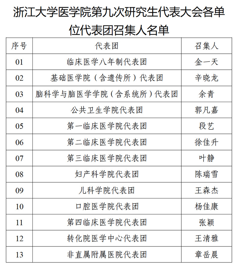 以各系所、临床医学院为单位,组成13个代表团,分别为临床医学八年制代表团、基础医学院(含遗传所)代表团、脑科学与脑医学学院(含系统所)代表团、公共卫生学院代表团、第一临床医学院代表团、第二临床医学院代表团、第三临床医学院代表团、妇产科学院代表团、儿科学院代表团、口腔医学院代表团、第四临床医学院代表团、转化院医学中心代表团、非直属附属医院代表团,各代表团推选出代表团团长1人,人数较多的代表团可酌情推选副团长1人,负责本团的工作。