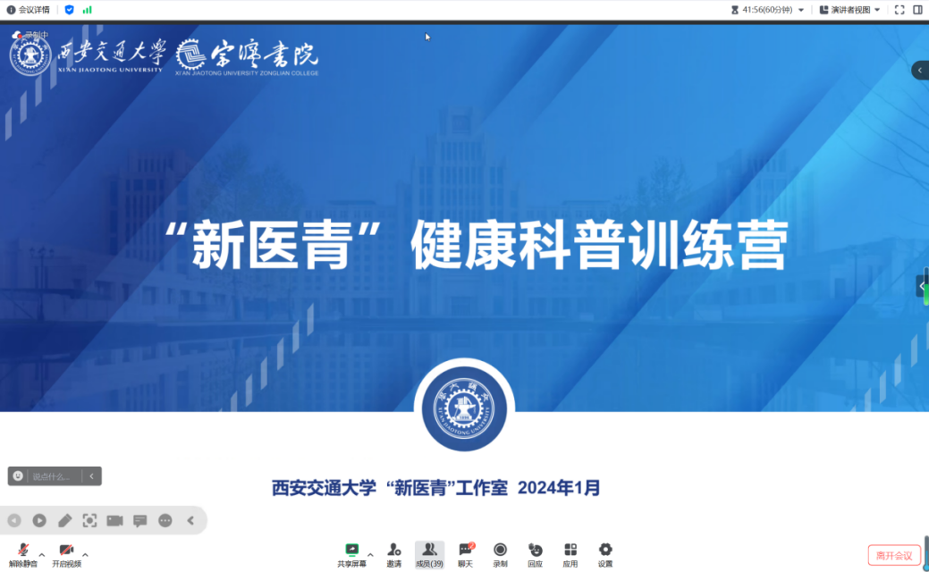 “在学中讲,在讲中学,用理论指导实践,用实践检验理论”,西安交通大学宗濂书院团委书记曹景强老师在介绍西安交通大学健康科普实践队伍时说道,“调动广大医学青年参与健康促进与传播事业的积极性,选拔培养出一支理论扎实、技能过硬、政治保证的健康科普队伍一直是我们的初心”。西安交通大学“新医青”健康科普训练营负责学生高鑫琪对本次实践活动及科普内容安排进行了全面的介绍:“本次具体内容设置专题讲座、导师匹配、精品带教、社会实践、成果转化等环节,将从理论输入与实践输出两方面上好社会实践必修课”,并表示:“非常希望可以和各兄弟高校交流实践经验,做好实践事业”。