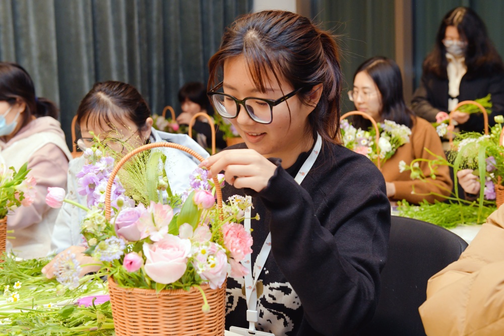 通过插花艺术体验,教职工们在花的世界里消解了疲乏,收获了快乐。在今后的工作中,她们将以更加饱满的热情和积极的心态,投入到学院的各项事业建设。