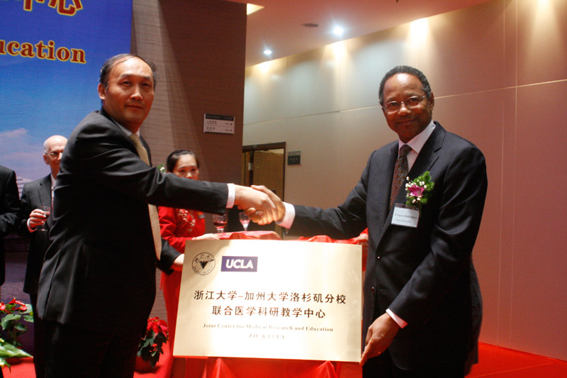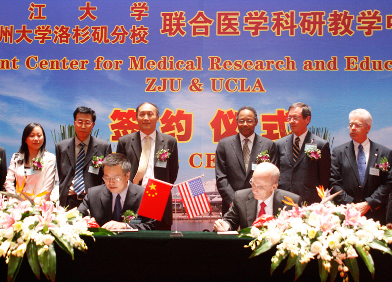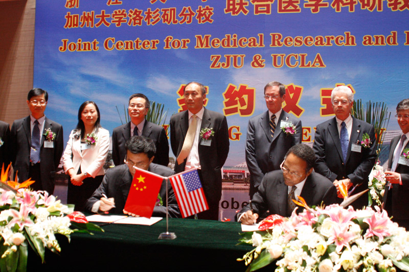 In the afternoon meeting of October 22, the two institutions discussed the development of ZJU-UCLA Joint Center for Medical Research and Education. The Joint Center signing ceremony was held in the lobby of School of Medicine. President Yang Wei and vice chancellor Eugene Washington signed the agreement and also gave a speech of the cooperation and friendship between ZJU and UCLA.