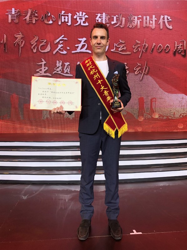 On April 25, 2019, Hangzhou City celebrated the 100th anniversary of the May Fourth Movement and presented the “Ten Outstanding Young Talents Award”. Tim Clancy, an Australian student at Zhejiang University, won this coveted title. It is the first time that an overseas youngster has received this award. Tim Clancy is an undergraduate student majoring in clinical medicine. In his spare time, he dedicates himself to volunteer work and is thus hailed as a foreign “Lei Feng” in Hangzhou. Meanwhile, he also creates TIM Workshop with a view to promoting and disseminating the Chinese culture in the international arena.
