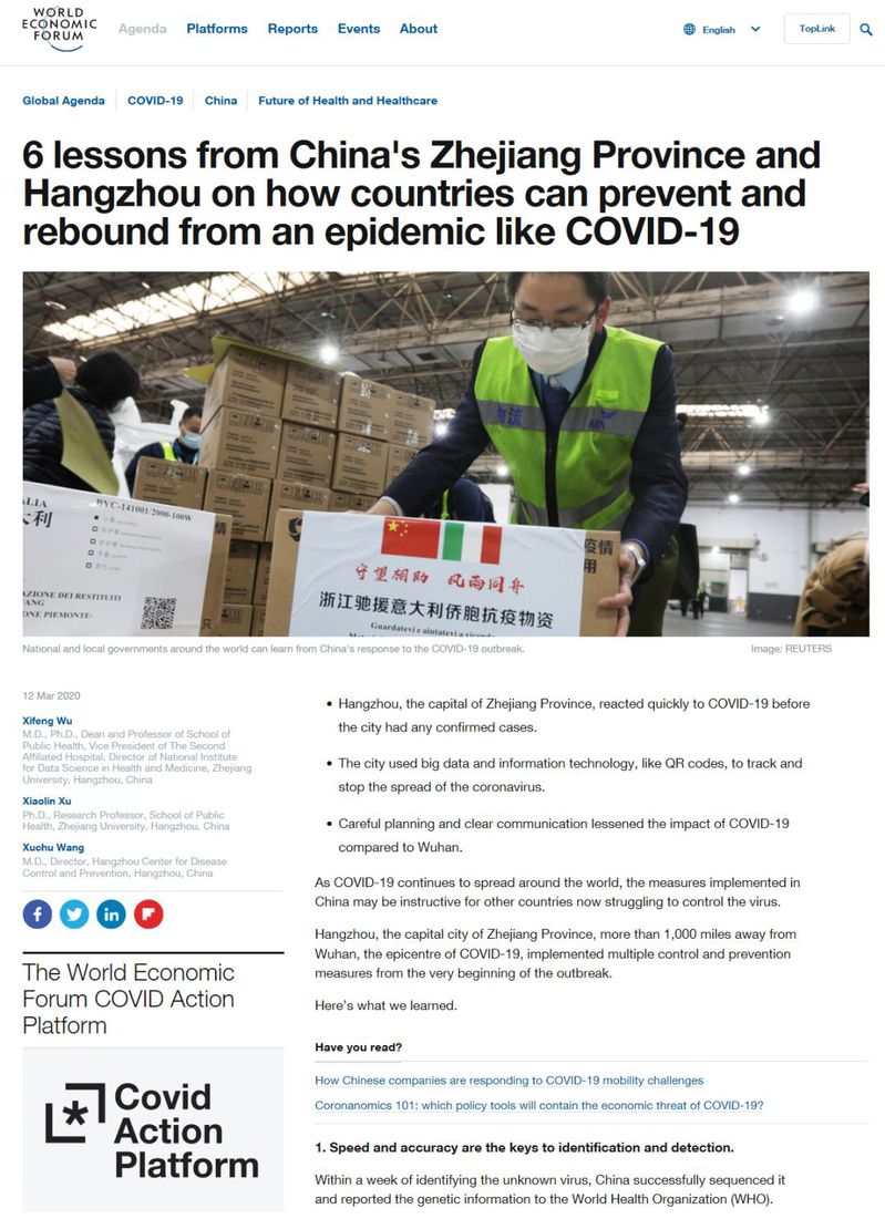 Recently, WU Xifeng, Dean and Professor of School of Public Health, Vice President of The Second Affiliated Hospital, ZUSM, also one of the first bathes of ZJU Global Ambassador, XU Xiaolin, Researcher Professor at the School of Public Health,ZUSM, WANG Xuchu, Director, Hangzhou Center for Disease Control and Prevention, Hangzhou sharing 6 lessons on preventing experience regarding epidemic like COVID-19 on World Economic Forum website, introducing epidemic prevention and control experience of Hangzhou and Zhejiang Province. Key lessons are as followed,