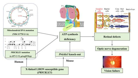 In this study, the team of Professor Guan Minxin conducted systematic large-scale gene screening of more than 200 Han ethnic LHON families, and discovered the X-linked gene PRICKLE3 through exome sequencing, biological information analysis and functional verification. Through a series of functional analysis of patient-derived cell lines and gene knockdown Hela cell lines, it was found that PRICKLE3 mutations affect the assembly, stability and function of mitochondrial ATP synthase, leading to abnormal energy metabolism. The PRICKLE3 mutation and the mitochondrial gene 11778G>A mutation work synergistically, which aggravates the mitochondrial energy metabolism disorder, resulting LHON. In addition, the PRICKLE3 knockout mice showed typical clinical phenotypes of LHON patients such as atrophy of optic ganglion cells and abnormal fundus blood vessels. This study revealed the synergy between mitochondrial mutation and X-linked nuclear modification gene mutation leading to the pathogenic mechanism of LHON, and solved the unsolved mystery of male prevalsence. This is a major breakthrough in the research of the pathogenic mechanism of hereditary eye diseases. It provides theoretical basis and technical support for the precise diagnosis, intervention and treatment of LHON, and also has a reference significance for the precise intervention treatment of other maternal genetic eye diseases and other diseases.