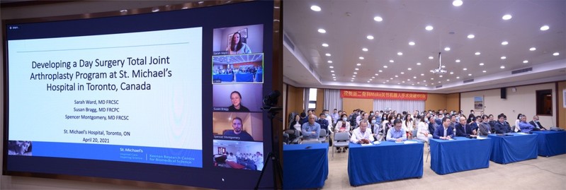 On April 21st, Professor Sarah Ward, Dr. Susan Bragg and Dr. Spencer Montgomery from St. Michael's Hospital in Toronto, Canada, shared great ideas with participants, focusing on the experience of total joint replacement in day surgery and postoperative rehabilitation methods. On June 12th, Hue Luu, MD, University of Chicago School of Medicine, Fabio Orozco, MD, Philadelphia Thomas Jefferson hospital gave the lecture on possible problems of the total knee replacement surgery operation assisted by the Mako robot.On July 22nd, Professor Alistair Irwin of The Royal Victoria Hospital talked about how to improve the quality of life of patients by using accurate methods of spinal tumor resection such as needle biopsy, imaging and clinical surgery. On September 16th, Professor Alistair Irwin of The Royal Victoria Hospital, answered and discussed the questions raised last time again. It reviewed the treatment progress of spinal tumor, the methods of targeted radiotherapy and proton radiotherapy for osteosarcoma.