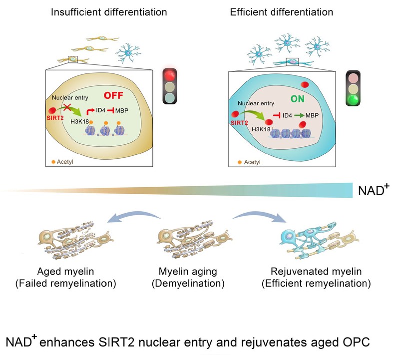 Finally, the study clearly dissected the molecular mechanisms underlying the effects of NAD+: aged OPCs are depleted in SIRT2 nuclear localization and have less NAD+. Supplementation of β-NMN elevates the NAD+ level, restores nuclear entry of SIRT2 in the aged OPCs and deacetylates H3K18, thus suppressing the transcription of ID4 and further promoting OPCs differentiation, and eventually delays myelin ageing in the normal CNS and enhances myelin repair in the demyelinated aged CNS (See the Schematic Figure).