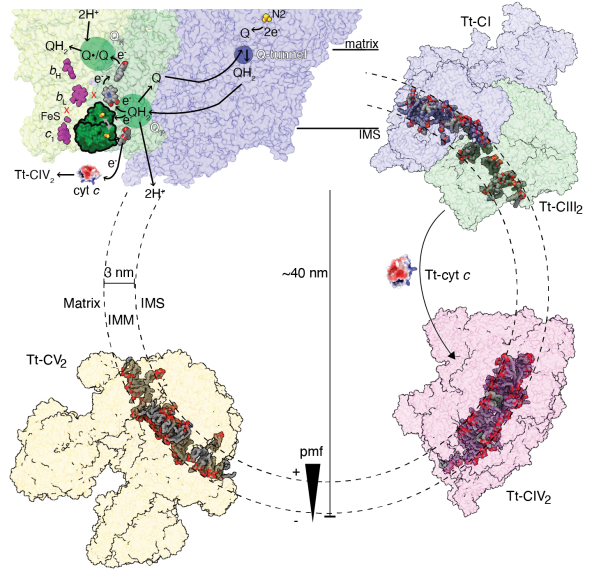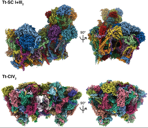 On March 31st 2022, Dr. ZHOU Long from the Zhejiang University School of Medicine and Dr.James Letts from the Molecular and Cellular Biology Department at University of California Davis collaborated to publish a research article in the journal Science. The study reported cryoEM structures of a 2.3 MDa super-complex I+III2 (SC I+III2) and a 2.7 MDa complex IV dimer (CIV2) of Tetrahymena thermophila (Tt), a key ciliate model organism belonging to the Alveolata clade, at 2.6 Å and 3.0 Å resolution respectively. Compared to the 1.4 MDa mammalian SC I+III2 with 67 subunits, Tt-SC I+III2 encompasses 91 subunits, out of which 20 subunits have no reported homologues. Moreover, the Tt-CIV2 has 52 subunits per protomer and has surpassed CI as the largest individual ETC complexes, while existing eukaryotic CIV structures usually consist of 10-14 subunits with ~200 KDa mass.
