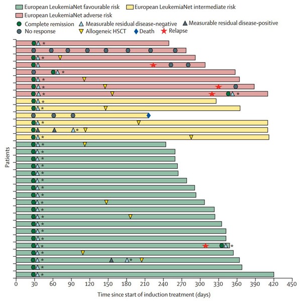 On May 2nd, the research team led by Prof. JIN Jie and the team led by Prof. ZHU Hong-Hu from the First Affiliated Hospital, Zhejiang University School of Medicine, published an article entitled “Venetoclax plus 3 + 7 daunorubicin and cytarabine chemotherapy as first-line treatment for adults with acute myeloid leukaemia: a multicentre, single-arm, phase 2 trial” in Lancet Haematology. This study aimed to evalsuate the efficacy and safety of veneclax combined with the 3+7 regimen (DAV regimen) in treatment-naive adult AML patients.