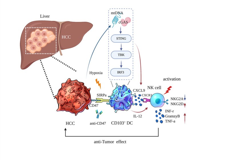 The CD47-signaling regulatory protein alpha (SIRPα) axis can participate in the process of tumor immune escape by hindering the phagocytosis of dendritic cells (DCs). However, the behavior of dendritic cells in the tumor microenvironment of hepatocellular carcinoma (HCC) after CD47 blockade treatment and the potential interactions between dendritic cells and natural killer cells (NK cells) remained unclear. This study demonstrated that CD47 blockade triggered CD103+ DC phagocytosis and enhanced STING pathway activation. The researchers observed the overexpression of CD47 in HCC specimens with high HIF-1α expression; CD47 overexpression was accompanied by decreased CD103+ DC and NK cell numbers, which were associated with poor prognosis. Consistently, in an orthotopic liver tumor model, CD47 blockade enhanced NK cell recruitment and activation due to the secretion of CXCL9 and IL-12 by CD103+ DCs, and this effect was abolished by CD103+ DC depletion (Batf3-/- mice) and IL-12 blockade in vivo. Furthermore, a STING inhibitor and STING deficient CD103+ BMDC notably reversed the effect of CD47 blockade, suggesting that STING pathway activation was crucial for the secretion of CXCL9 and IL-12 by CD103+ DCs. Moreover, they observed that the antitumor efficacy of CD47 blockade still occurred in the absence of T cells, suggesting that the CD103+ DC-NK cell axis is an efficient pathway in addition to the DC-T cell axis in an orthotopic liver tumor model. Overall, the CD103+ DC-NK cell axis serves as an independent pathway that is involved in antitumor processes and contributes to a favorable response to CD47 blockade in HCC.