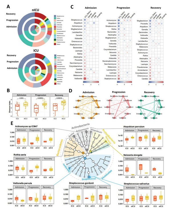 Figure3. Respiratory tract and gut microbial dynamics during COVID-19 progression and their diagnostic potential for disease severity