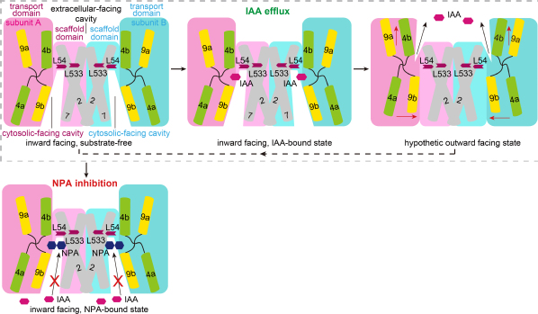 GUO Jiangtao et al. determined the cryo-EM structures of Arabidopsis thaliana PIN3 (AtPIN3) in the apo state (AtPIN3apo) and in the IAA-bound state (AtPIN3IAA). AtPIN3 exists as a homodimer. In each subunit, AtPIN3 contains 10 transmembrane helices (TM1-10) and TM1-5 and TM6-10 are inverted structural repeats. AtPIN3apo and AtPIN3IAA are similar to each other in structure and in an inward-facing conformation. AtPIN3 is comprised of the scaffold domain and the transport domain. In AtPIN3IAA, IAA binds in an inward-facing pocket between the scaffold domain and the transport domain and have hydrogen-bonding and hydrophobic interactions with multiple conserved amino acid residues.