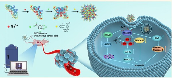 The researchers designed an “all-in-one” olaparib-Ga self-assembled nanodrug for the treatment of HRR-proficient ovarian cancer. olaparib-Ga featured an ultrasmall size of 7 nm and exhibited an excellent suppressing capacity on the cell viability of two HRR-proficient ovarian cancer cell lines (SKOV3 and OVCAR3) compared with olaparib alone. The synergistic effect of gallium- (III) and olaparib in HRR-proficient ovarian cancer cells was demonstrated. The enhanced therapeutic effect of olaparib-Ga might be attributable to suppression of RRM2 expression, activation of the Fe2+/ROS/MAPK pathway and HMOX1 signaling, inhibition of the PI3K/AKT pathway, and enhanced cleaved-caspase 3 and BAX protein expression. Furthermore, olaparib-Ga effectively restrained SKOV3 and OVCAR3 tumor growth and exhibited negligible toxicity in vivo.
