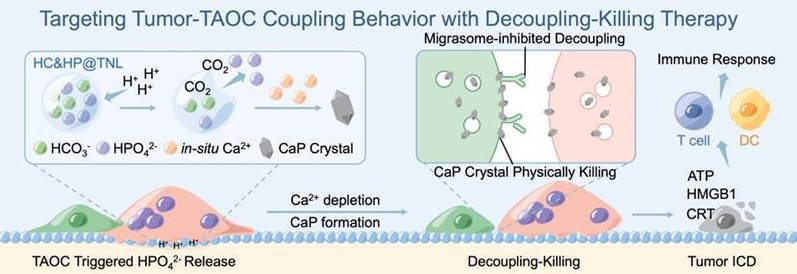The team has previously developed liposomes that specifically release sodium bicarbonate in the acidic sealing zone of osteoclasts for preventing osteoporosis, and the related research is published in Journal of the American Chemical Society. Inspired by this strategy, they developed a new type of anti-osteoclast landmine. Dr. Chen introduced that there are two substances in this nano-scale liposome landmine: one is sodium bicarbonate, which can react with acid secreted by osteoclasts to produce gas, thus detonating the landmine; The other is sodium hydrogen phosphate. After the mine is detonated, hydrogen phosphate ions will form sharp calcium-phosphorus crystals with calcium ions in situ, which stab into the cell membrane of tumor cells and cause physical damage.