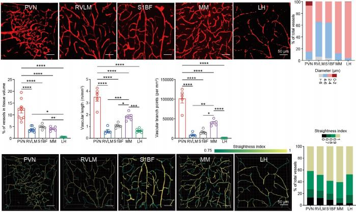 On August 7, 2024, Immunity published a study entitled “Microglia in the hypothalamic paraventricular nucleus sense hemodynamic disturbance and promote sympathetic excitation in hypertension” by Dr. SHI Peng from Zhejiang University Institute of Translational Medicine. In this study, it shows that a subtle but significant increase of plasma ATP triggers microglia, the resident immune cells in the brain, switching from a surveillant towards a reactive state. ATP is an intracellular “cash” to supply energy for biochemical reactions. An increase of extracellular ATP is considered as a danger signal to immune cells. Nearly all immune cells express various purinergic receptors, which render the “police cells” remarkably alert to cell or tissue damages. When blood cells such as red blood cells experience increased sheer stress due to blood pressure increase, intracellular ATP would be released via transiently opened pannexin channels, leading to an ATP elevation in blood plasma. This blood-borne ATP is detected by purinergic receptors P2Y12 of microglia. By using a series of loss-of-function approaches, the researchers finally validated that ATP-P2Y12 ligation is required for microglial activation, which subsequently promotes the electronic activity of sympathetic neurons by secreting proinflammatory mediators. Consequentially, it leads to a massive and sustained elevation in SNA and blood pressure. More importantly, this study unravels a precedently unappreciated microanatomic structure in the brain which predisposes the paraventricular nucleus (PVN), a hub of sympathetic regulation, susceptible to hemodynamic alteration. The research group found that the PVN possesses the highest microvessel density, the thinnest lumen diameter, the least straightness, and the most ramification compared with the other examined brain regions (Figure 1). As such, the cerebral blood flow would be slower and leave sufficient time window for small molecules, e.g., ATP (507 Da) to undergo extravasation. With the aid of magnetic resonance imaging (MRI), this study found that transient increase of arterial blood pressure resulted in an exclusive increase of blood perfusion in the PVN rather than other brain regions (Figure 2). Altogether, the data strongly indicate that a unique vascular topology renders the PVN receiving more blood-borne ATP in blood pressure increase, which drives a sympathetic overflow in hypertension.