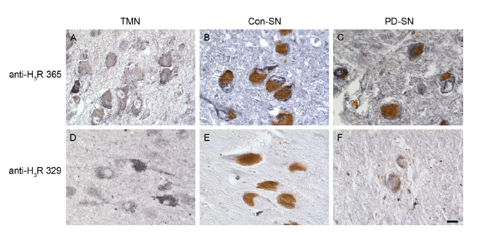 The expression of histamine receptor 1-4 (H1- 4R) and histamine methyltransferase was determined in the histamine projection areas which are...